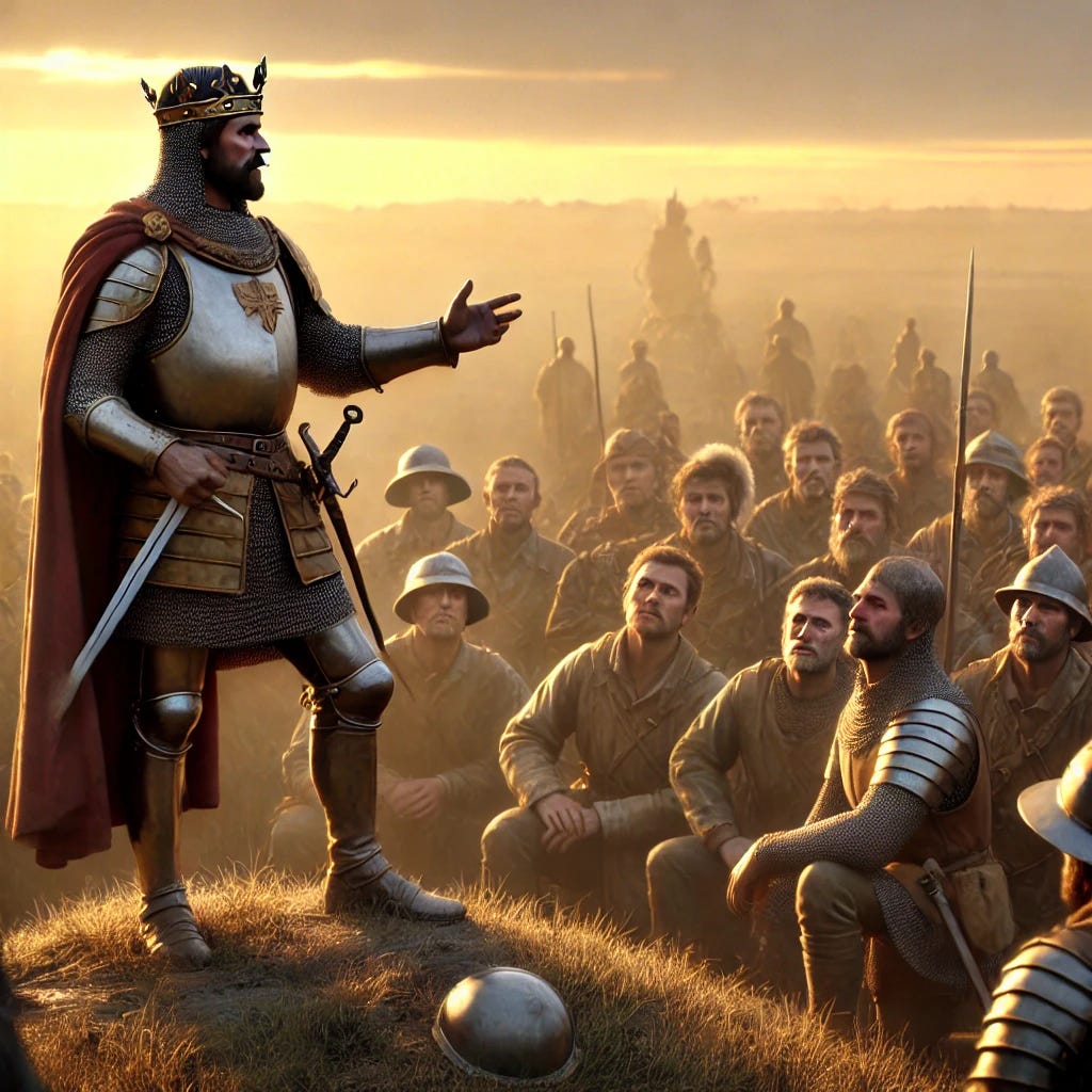 Saccio delves deeply into the historical and theatrical portrayal of Henry V, situating him as the epitome of the Christian warrior-king. Shakespeare’s Henry, particularly in Henry V, is a man of action and conviction, who sees himself as an instrument of divine will. His stirring speeches—most famously the St. Crispin’s Day oration—rally his men with the assurance that God is on their side, casting their fight against the French as both a political and spiritual mission.